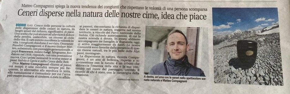 La pratica di dispersione delle ceneri segue un iter burocratico particolare e permette ai dolenti di disperdere le ceneri del proprio caro in luoghi maestosi presenti nel Parco Nazionale dello Stelvio (Es. Passo dello Stelvio, Passo Gavia, Croce della Reit).