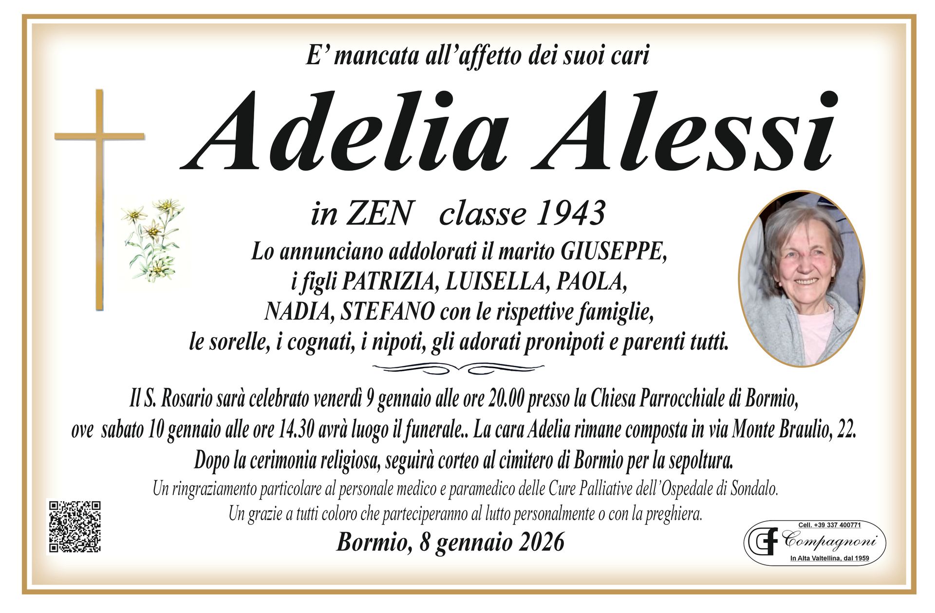 Dopo la cerimonia religiosa, seguirà la tumulazione nella tomba di famiglia presso cimitero di Bormio.